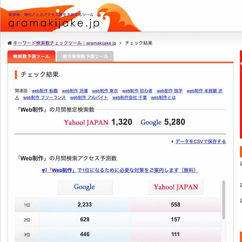 aramakijake.jpは、文言の月間検索数とこれからの検索数はどうなるかを予測するWebサービスです。