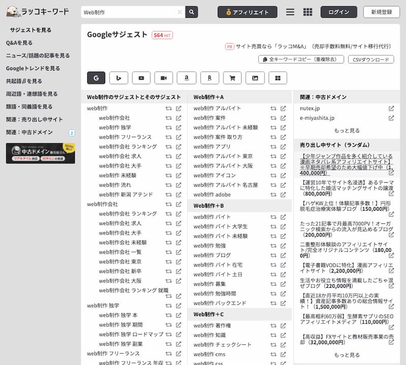 ラッコキーワードは、Googleなどの検索サジェストと関連ワードを探してくれるサービスです。膨大な数が出てくるので強みにあう関連ワードを探しましょう。